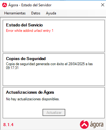 Cuando da este error es porque el servicio Agora ha perdido el usuario, asignar el usuario AGORA_SERVICE con su contraseña y reiniciar el servicio.