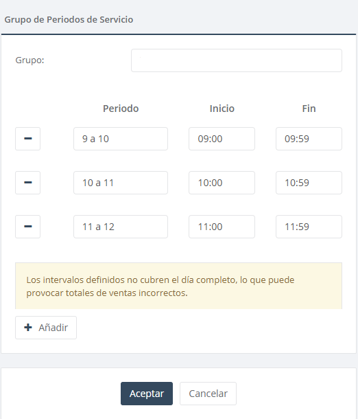 A tener en cuenta, si cerráis después de las 00:00 hay que poner ese rango en la parte final, ya que los grupos de periodo de servicio se rigen por el día que se abrió la Jornada, es decir, si estamos a día uno y pasamos de las 00:00 que ya sería día 2, el sistema lo contabilizará como día 1, porque cuenta el día que que se abre la jornada.
