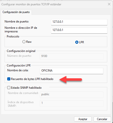 En la siguiente pantalla marcamos el protocolo LPR, en nombre de cola el nombre de la impresora compartida y en mi caso me ha funcionado marcando el check de recuento de bytes LPR habilitado: