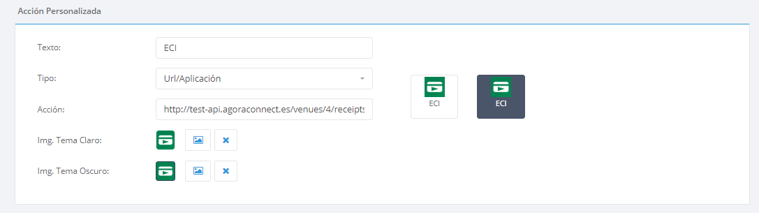 Se debe crear una acción personalizada en Ágora utilizando la URL generada por la integración en Connect Manager.