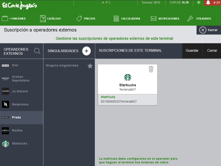 Si se desea vincular un terminal concreto a un dispositivo externo, puede crearse una singularidad exclusiva (ej.: Terminal607) asegurando que solo ese terminal reciba las órdenes correspondientes.