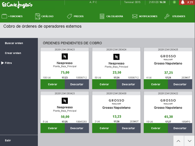 La función de cobro de Extensibilidad 3.0 permite que los terminales visualicen todas las órdenes publicadas por operadores externos a los que estén suscritos.