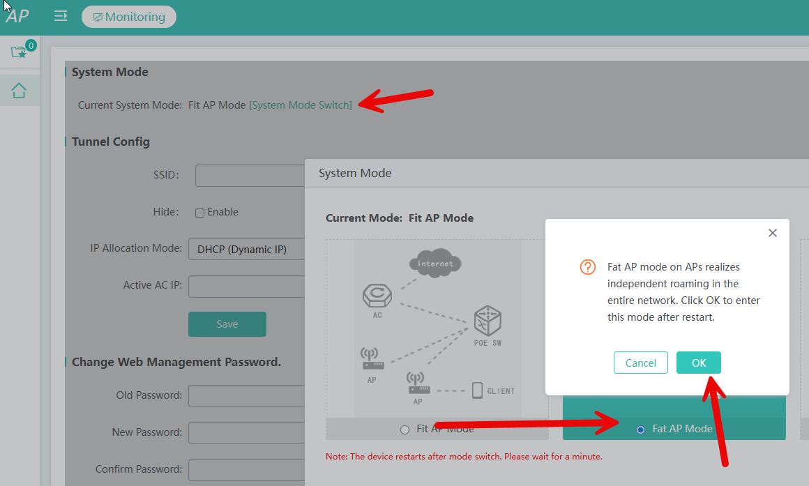 Una vez dentro le ponemos en system mode Switch en Fat AP mode, y se reiniciará la antena: