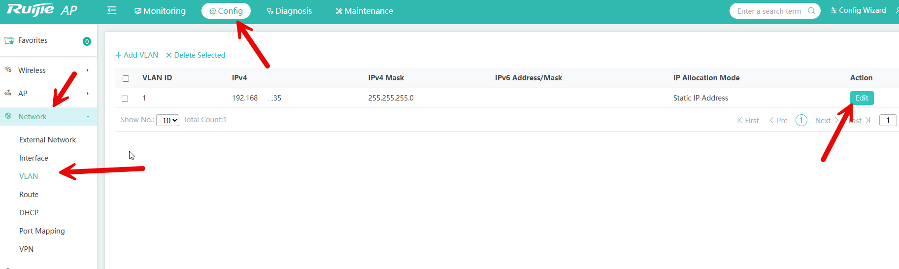 Entramos a la administración web y nos vamos a config -> Network -> VLAN y le damos a edit: