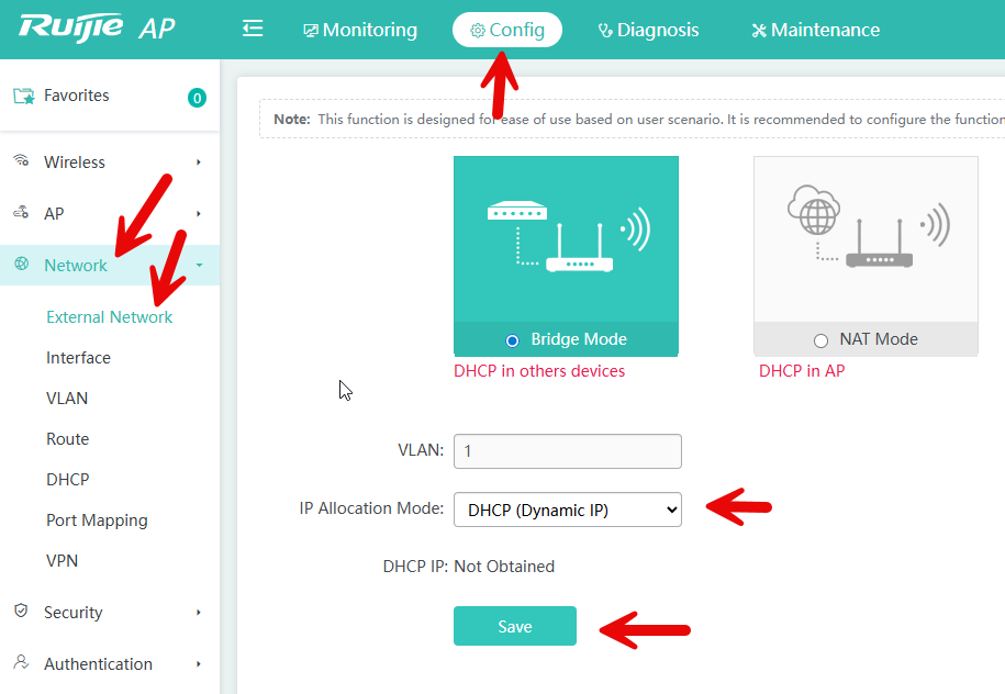 En Config --> Network --> External network lo ponemos por DHCP: